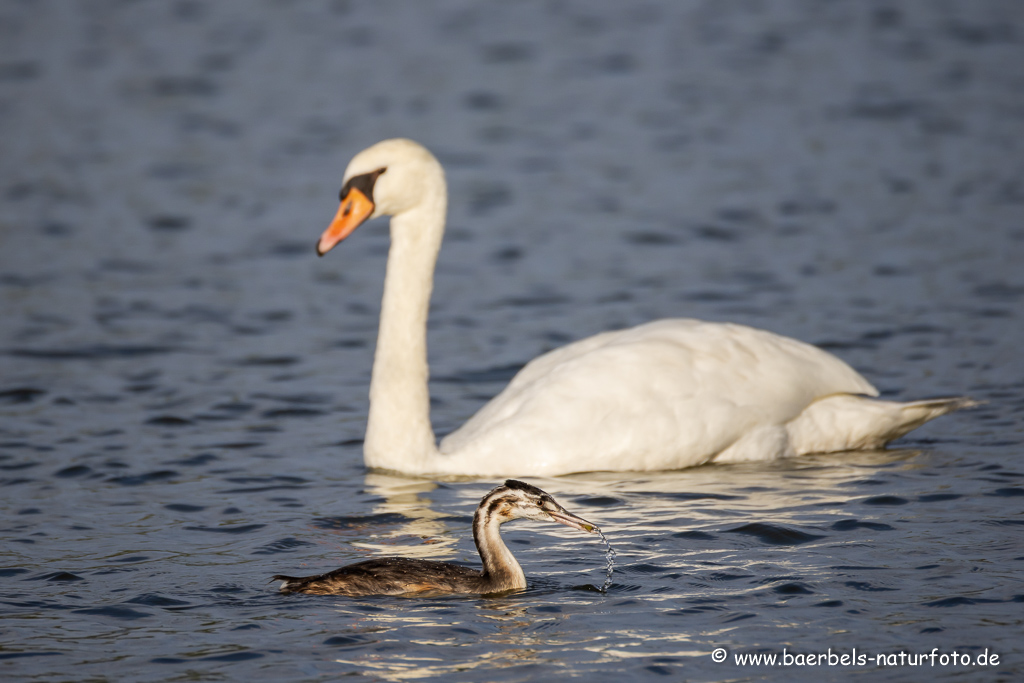 Junger Haubentaucher frißt was auf dem Wasser schwimmt